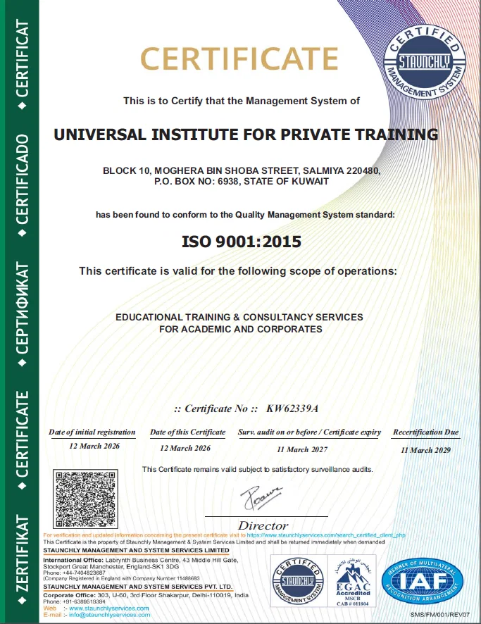 Universal Institute for Private Training (UI Kuwait) is dedicated to delivering education that meets international benchmarks. Our ISO 9001:2015 Certification (No: KW62339A) confirms that our Quality Management System is aligned with the highest global standards for Educational Training & Consultancy Services.